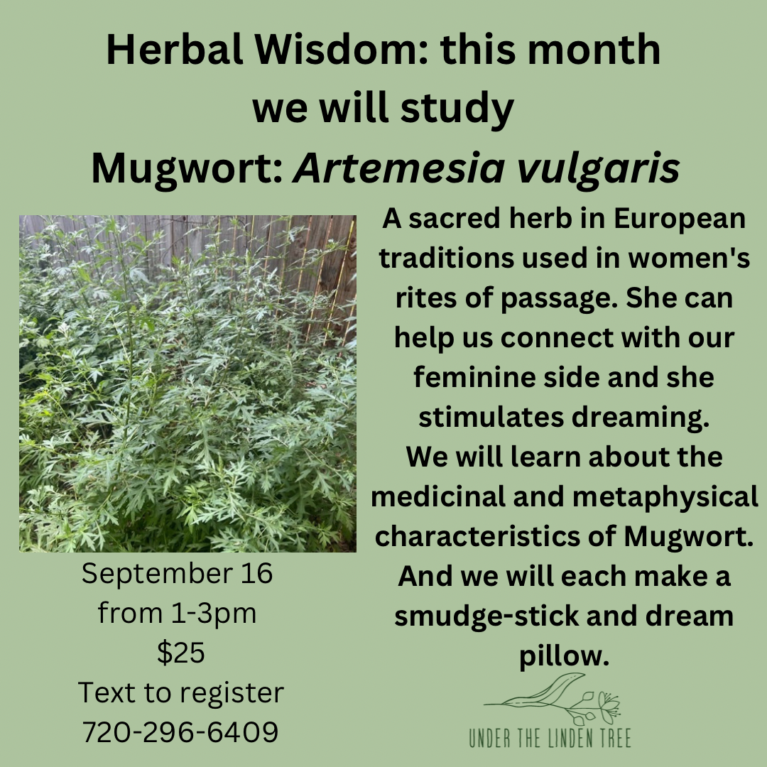The Herbal Wisdom classes are two hours learning about one herb. This month will will study Mugwort. If you enjoy burning incense or smudge-sticks this is the class for you. Mugwort is a beautiful herb to burn for cleansing and meditation. We will also learn about the medicinal benefits of Mugwort.